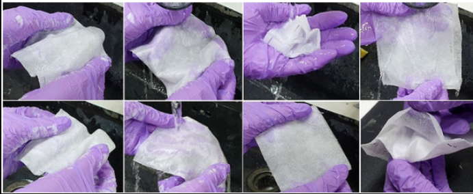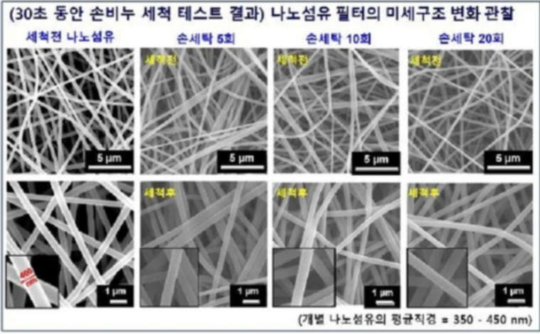 비누를 이용해 손으로 빨았을때 카이스트 나노마스크의 미세구조 변화입니다. 사진상으로봐도 큰 변화가 없어보입니다.