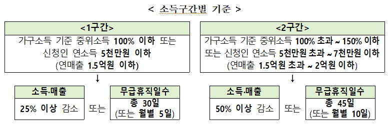 코로나19로 인해 매출이 감소하거나 소득이 감소하였다면, 그리고 무급휴직을 하였다면 지원 받을 수 있습니다.