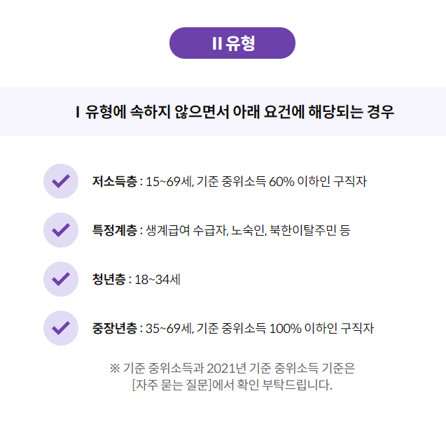 중위소득 50%이하를 만족해야하며 재산또한 3억원 이하를 만족해야 합니다. 요건심사형의 경우 2년이내 100일이상 또는 800시간 이상의 취업경험을 가지고 있어야 하며 선발형의 경우 취업경험이 없어도 가능합니다.