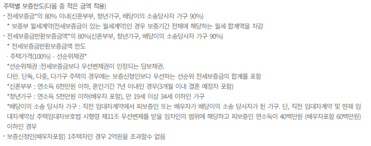- 전세보증금*의 80% 이내(신혼부부, 청년가구, 배당이의 소송당사자 가구 90%)