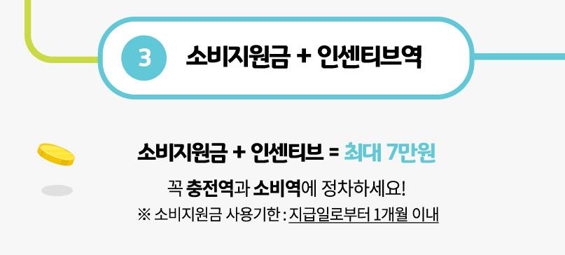 소비지원금(5만원) + 인센티브(2만원) = 최대 7만원 20만원 이상 소비하면 5만원 소비지원금 + 2만원 인센티브 추가 지급