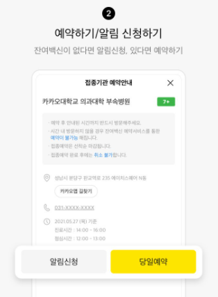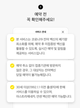 - 질병관리청 요청에 따라 잔여백신 알림 및 당일예약 신청은 30세 이상만(1991.12.31 이전 출생자) 가능해요.