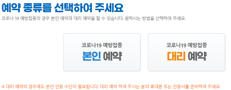예방접종 예약하기 버튼을 눌러주시면 본인예약과 대리예약을 선택할 수 있습니다.