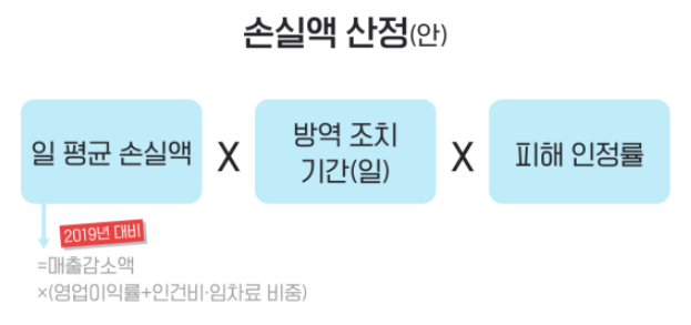 일평균손실액 * 방역조치기간(일) * 피해인정률을 곱하여 계산합니다.