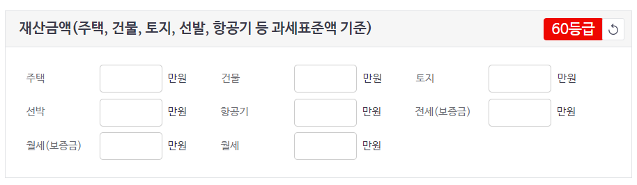재산금액은 주택, 건물, 토지, 선발, 항공기 등의 과세 표준액 기준을 입력합니다.