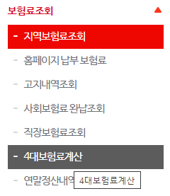 4대보험료 계산 메뉴에는 내 건강보험료 확인하기, 지역보험료 모의계산하기, 직장보험료 모의계산하기, 임의보험료 모의 계산하기 메뉴가 있습니다.