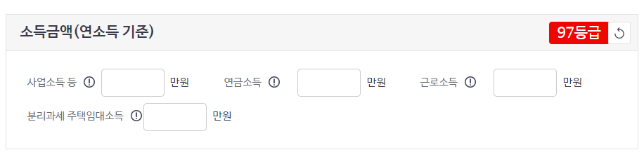 소득금액 입력에서는 사업소득, 연금소득, 근로소득, 분리과세 주택임대소득을 입력합니다. 단, 이때의 소득은 5월 종합소득세 신고시 입력한 자료를 기준으로 하므로 지난해의 소득자료를 입력하시면 됩니다.