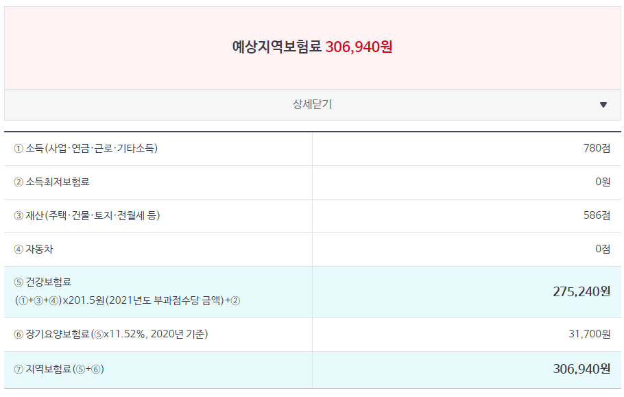 위방법대로 계산을 하게 되면 예상 지역보험료를 계산해볼 수 있습니다.