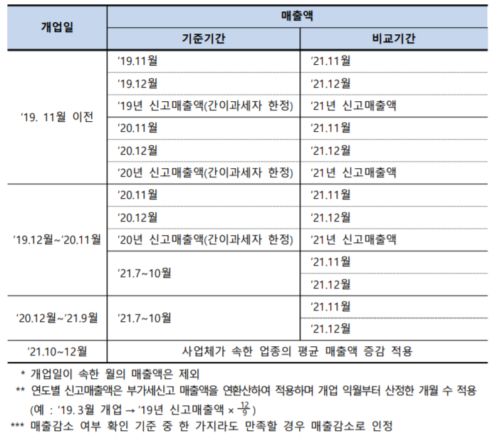 ‘21. 12. 18일 이후 중대본의 영업시간 제한 조치를 받은 소상공인·소기업·연매출 10억원 초과 30억원 이하 사업체는 영업시간제한에 따라 심각한 피해가 예상되므로 매출감소로 간주하여 지원합니다.