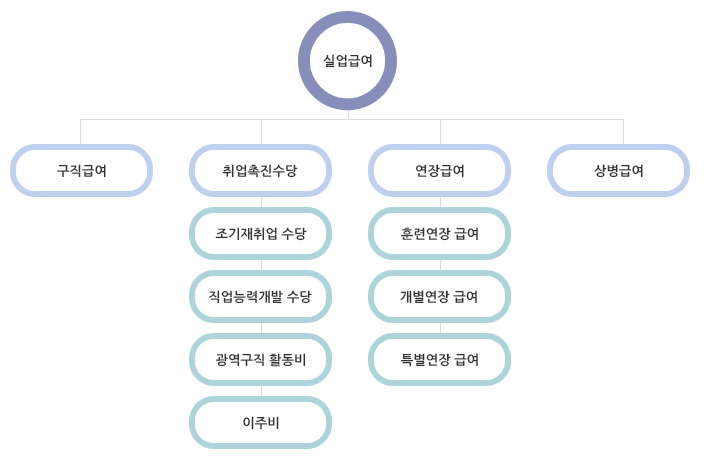 고용보험 실업급여는 구직급여, 취업촉진수당, 조기재취업수당, 직업능력개발수당, 광역구직활동비, 이주비, 연장급여, 훈련연장급여, 개별연장급여, 특별연장급여, 상병급여로 구분됩니다.