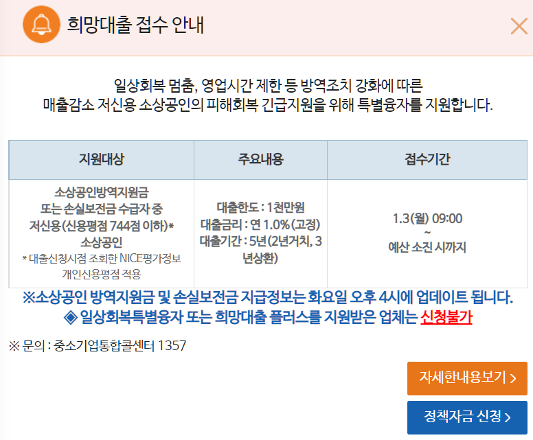 소상공인 방역지원금 또는 손실보전금 수급자 중 저신용 소상공인의 경우 희망대출 접수가 가능합니다. 또한 희망플러스 특례보증으로 신청을 받아 총 2000만원까지 지원을 받을 수 있게 됩니다. 신청을 하고자 하시는 분은 소상공인 희망대출 플러스 신청 홈페이지를 통해 신청방법 상세 안내를 받아보실 수 있습니다.