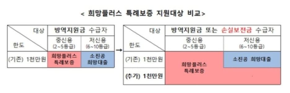 소상공인 희망플러스 대출의 보증 한도를 1000만원에서 2000만원으로 확대하여 신청을 받게 되며 보증 신청일 기준으로 중신용 소기업 소상공인 중 은행에서 희망플러스 신용대출을 받거나 희망플러스 특례보증을 이용하는 경우 1000만원을 추가로 지원받을 수 있게 됩니다.