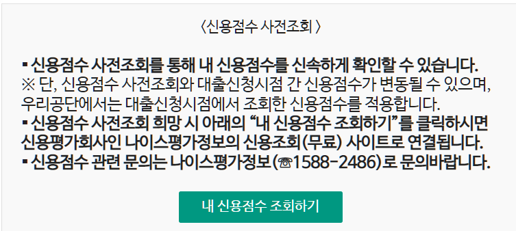 신용점수 사전조회를 통해서 신용점수를 바로 확인해 대상 여부를 판단해보실 수 있습니다. 신용점수 사전조사 희망시 내 신용 점수 조회하기를 클릭하면 신용평가회사인 나이스 평가정보의 신용조회 사이트에서 신용점수 확인이 가능합니다.