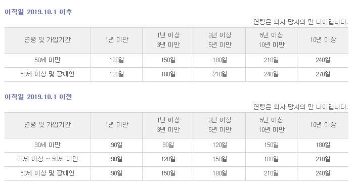 - 구직급여는 퇴직 당시 연령과 고용보험 가입 기간에 따라서 짧게는 120일에서 길게는 270일 범위 내에서 퇴직 전 평균 임금의 60%를 받을 수 있습니다. (이직일 2019.10.1 이전은 90일~240일 범위 내에서 퇴직 전 평균 임금의 50%)