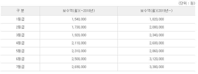 - 기준보수는 2016년 이후는 총 7등급, 2015년 이전은 총 5등급으로 구분됩니다.