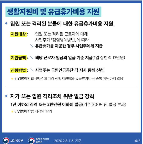 중앙사고수습본부에서는 입원 또는 격리된 사람들에 대한 생활지원을 위하여 「신종감염병증후군 및 중동호흡기증후군(MERS) 발생에 따른 유급휴가비용 및 생활지원비 지원금액」고시를 법률에 따라 관계부처 협의를 거쳐 최종 확정하였다. 중수본에 따르면 2월 17일부터 신청을 받을 예정이며, 예비비 등 관련 예산 편성이 마무리되는 대로 조속히 지급할 계획이라고 밝혔습니다.