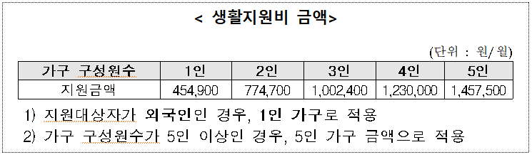 - 지원금액은 「긴급지원 지원금액 및 재산의 합계액 기준」에서 정하는 긴급복지 생계지원 금액을 준용하여 지원되며, 14일 이상 격리된 경우에 4인가구 기준 월 1,230,000원이 지급됩니다..