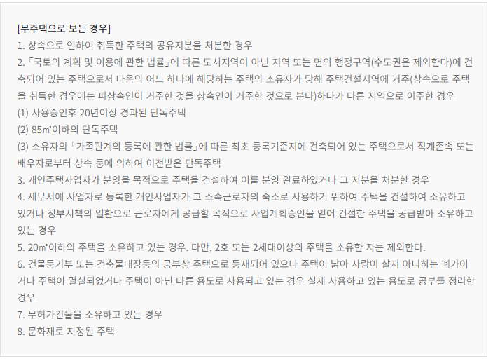 - 전체 건물면적에서 주택면적이 차지하는 비중이 ½미만인 복합용도 건축물(주택)과 임대용으로 등록된 주택인 경우는 주택보유수 산정에서 제외 (1/2 이상일 경우 주택보유 수 포함)