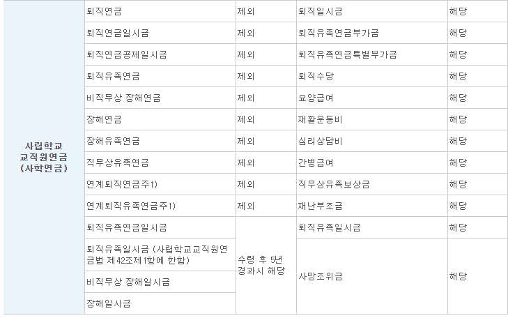 (국민연금, 공무원연금, 군인연금, 사립학교교직원연금, 산재급여)