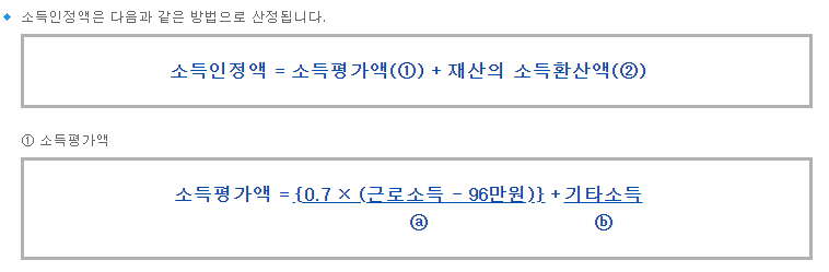 - 무료임차소득 : 자녀 소유의 고가 주택에 거주하는 본인 또는 배우자에 대하여 임차료에 상응하여 소득으로 인정하는 금액