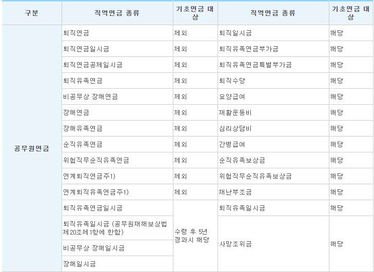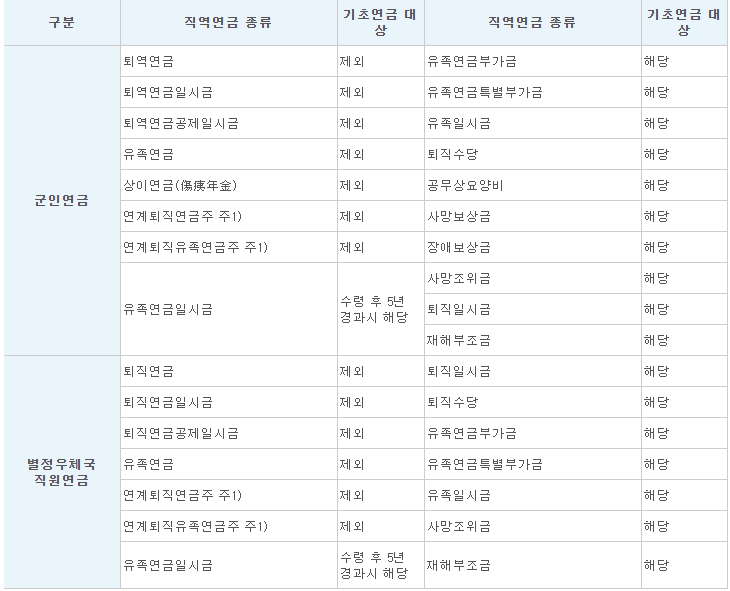 - 1) 직역(공무원·사립학교교직원·군인·별정우체국직원)재직기간이 10년 미만인 국민연금과 연계한 연계퇴직연금 또는 연계퇴직유족연금 수급권자 및 그 배우자